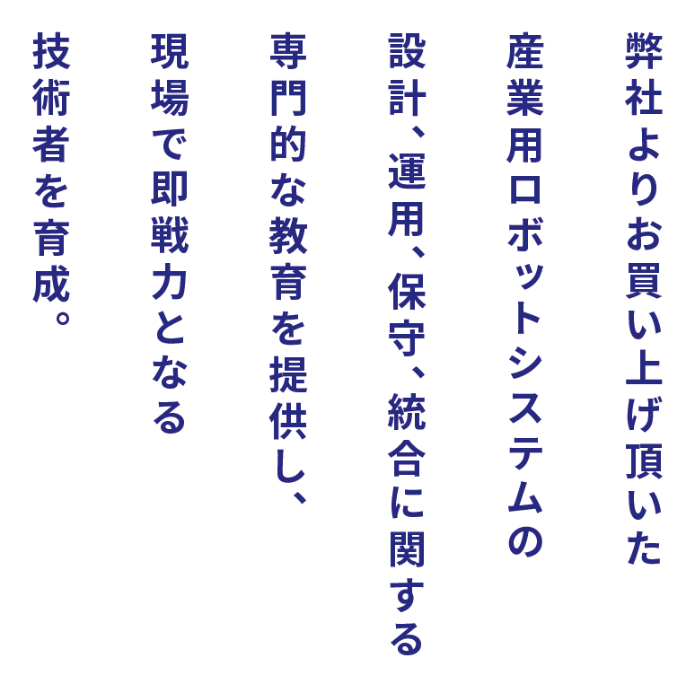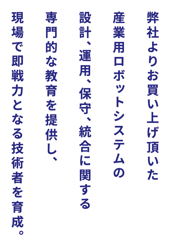 産業用ロボットシステムの導入・運用・保守に精通した、即戦力となる技術者を育成します。現場で必要とされる実践的なスキル習得を重視し、実技指導やシミュレーションを豊富に取り入れたカリキュラムを提供しています。